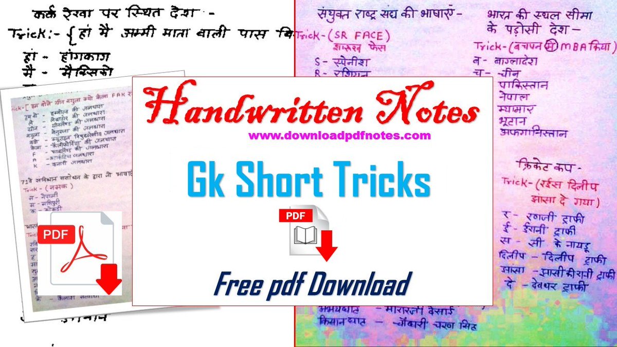 Downloadpdfnotes provide you important gk and gs free handwritten Notes with short and Smart tricks. You can get it free. You can say what a Trick, We includes more easy and smart tricks in these notes. Download it free form given below links given in this page.Visit Daily Downloadpdfnotes.com page for latest updates. We provide you daily new updates here.